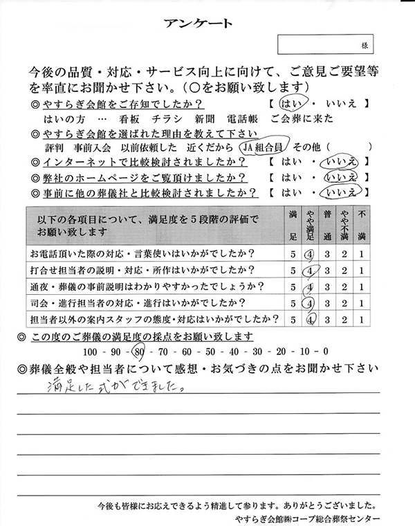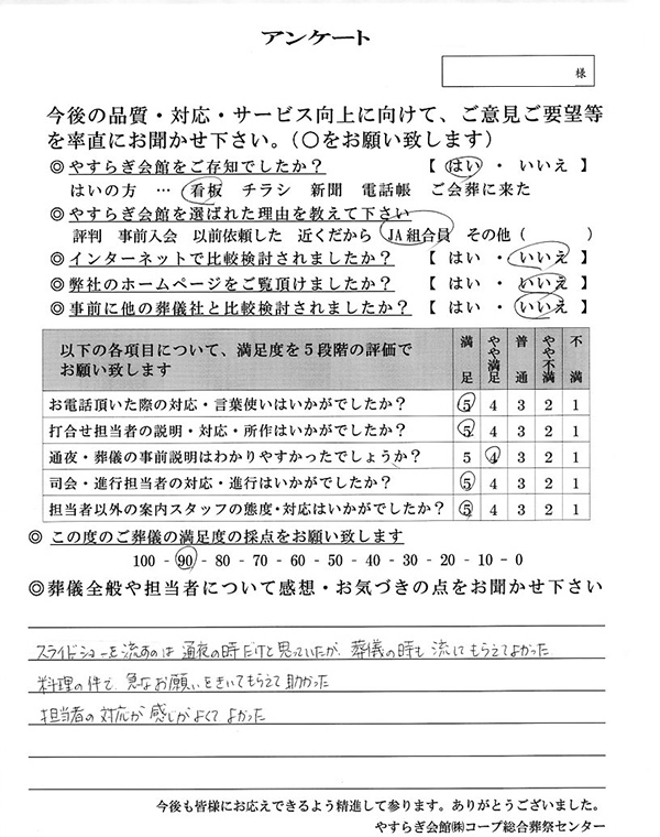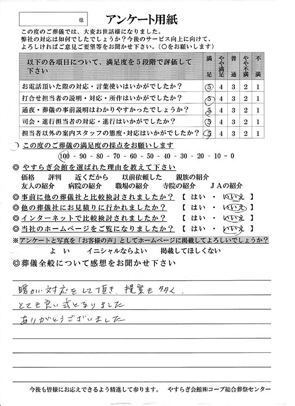 JA葬祭宇部やすらぎ会館では、お葬式・ご葬儀を終えられたお客様へ今後の品質・対応・サービス向上に向けて、率直なお客様の声を聞かせて頂きたくアンケートを実施しております。 お客様から頂いた、貴重なご意見をいかし、今後もお客様に満足・信頼して頂けますよう精進してまいります。 ※アンケートはお客様からの了承を頂いて掲載しております